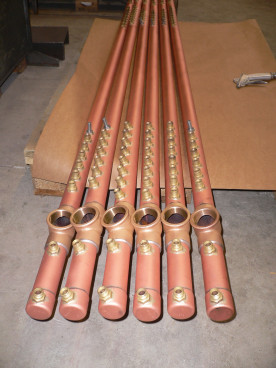 Diverse Stromschienen aus Kupferblech genibbelt, gelocht und gekantet und je nach Kundenwunsch mit hart oder weich aufgelötetem Kühlkreislauf.